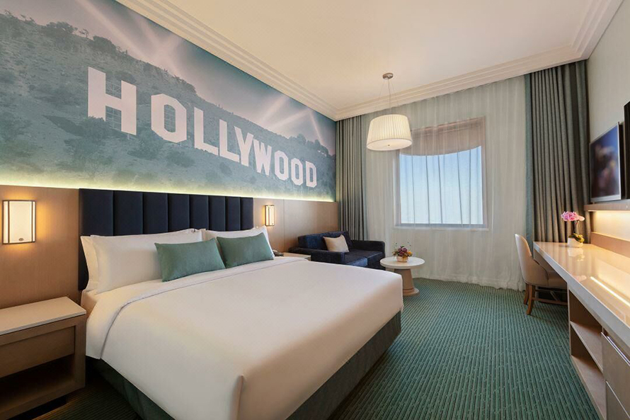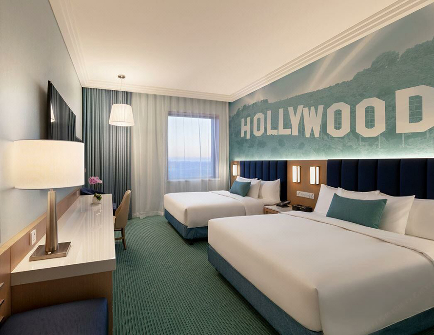 客房:酒店拥有多种房型供游客选择,包括豪华双大床房、小黄人双大床房等。客房设计充满好莱坞风情, 同时融入了现代化的舒适元素。房间内设施齐全,为客人提供舒适的住宿环境。